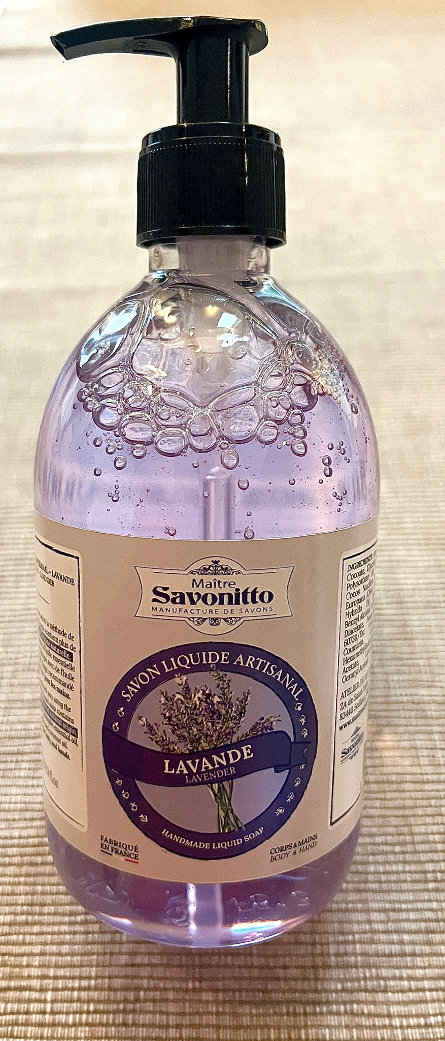 Nestesaippuan valmistusaineluettelo: Aqua (Water), Potassium Cocoate, Glycerin, Parfum/Fragrance , Polysorbate 80, Potassium Olivate, Cocos Nucifera (Coconut) Oil. Olea Europaea (Olive) Fruit Oil, Lavandula Hybrida oil, Hydroxyethylcellulose, Benzyl Alcohol, Tetrasodium Glutamate Diacetate, Potassium Hydroxide, CI60730/Ext Violet 2, Citronellol, Coumarin, Linalool, Camphor, Hexamethylindanopyran, Linalyl acetate, Lavandula oil/extract, Geraniol acetate.